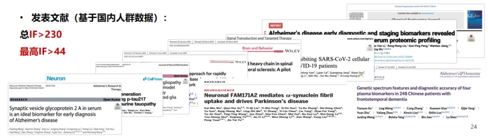 同時,宇測生物樹立國內(nèi)AD血液生物標(biāo)志物學(xué)術(shù)影響旗幟,不斷推進(jìn)以神經(jīng)科學(xué)為核心的新型生物標(biāo)志物的臨床轉(zhuǎn)化與市場推廣,與國內(nèi)多家頭部醫(yī)院形成深度合作,發(fā)表多篇高影響力學(xué)術(shù)論文。目前在高端科研和頭部臨床單位已完成兩萬多例血液樣本研究,參與多項國內(nèi)大型隊列研究,平臺累計發(fā)表IF>230,為神經(jīng)科學(xué)超敏血液生物標(biāo)志物的疾病的研究提供最強助力。