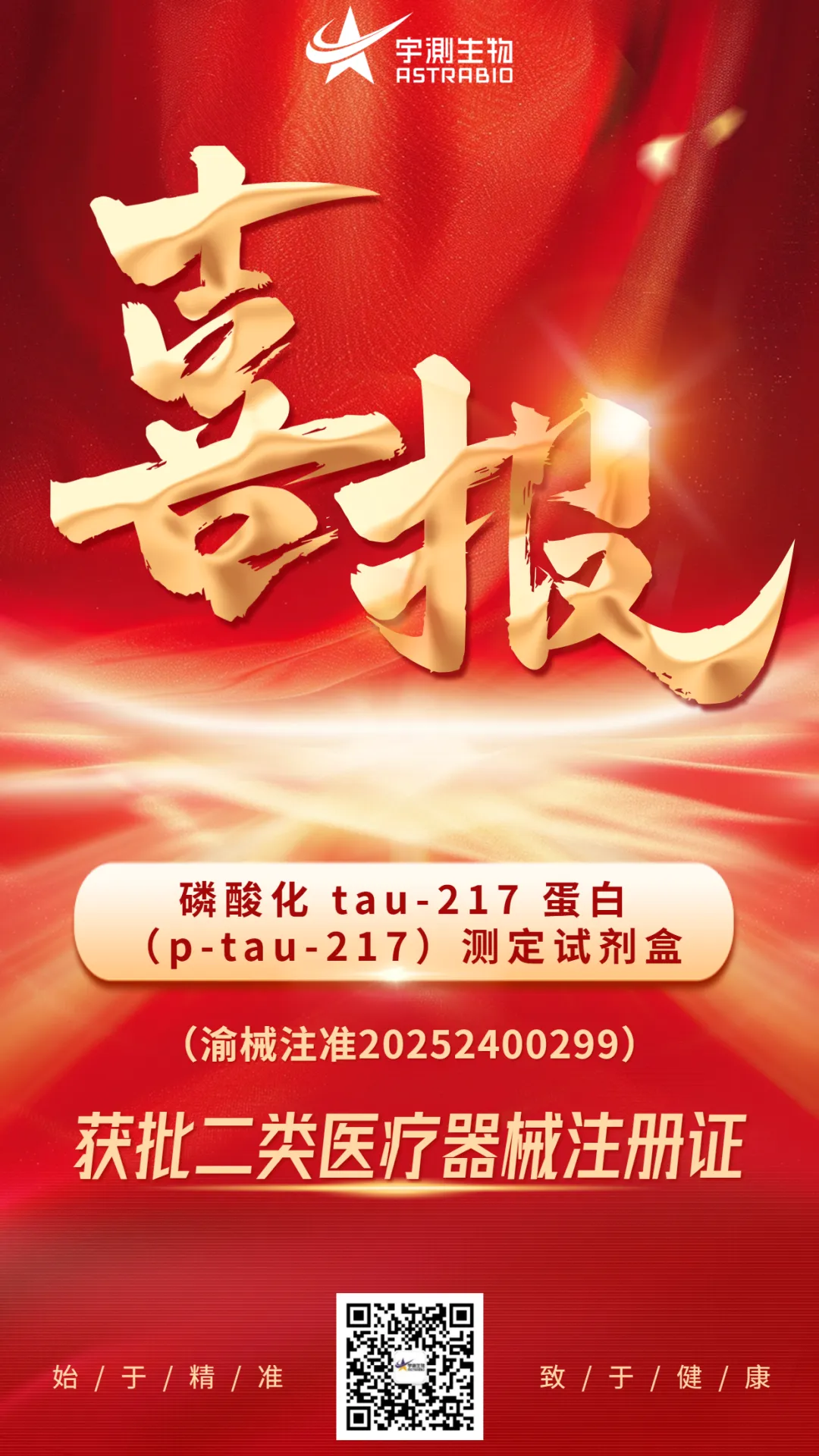 近日,宇測生物自主研發(fā)的神經(jīng)領(lǐng)域血液檢測試劑盒:磷酸化tau-217蛋白(p-tau-217)測定試劑盒,正式通過重慶市藥品監(jiān)督管理局審批,獲得二類醫(yī)療器械注冊證。該產(chǎn)品依托公司單分子分析策略的技術(shù)優(yōu)勢,僅需微量血液樣本即可實現(xiàn)fg/mL級別的的精準(zhǔn)檢測,為臨床檢測提供更方便、更精準(zhǔn)的血液早篩工具。